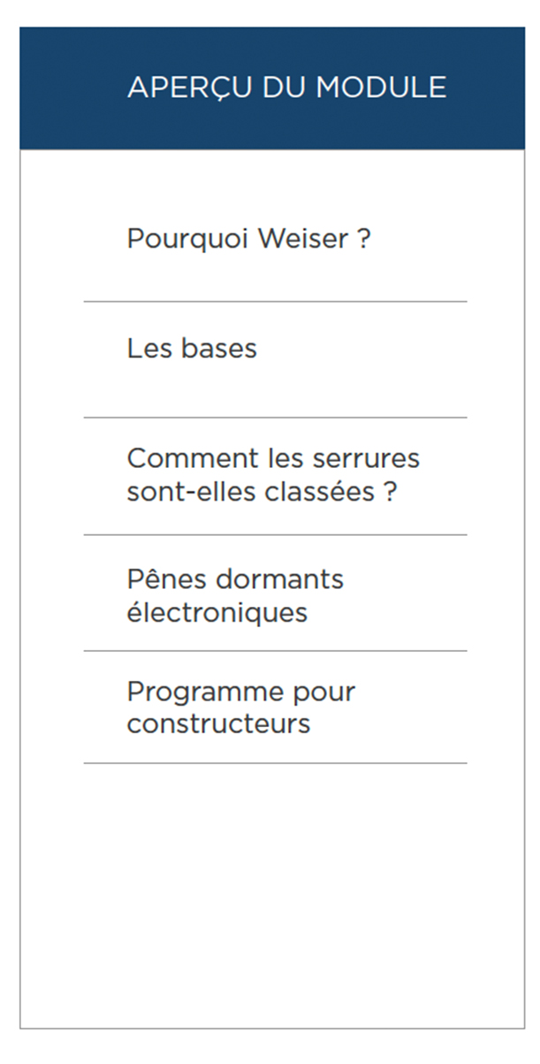 Tout commence par trois mots : sécurité, technologie, commodité. Suivez ce cours qui constitue une introduction complète aux philosophies fondamentales qui sous-tendent la marque Weiser. Avec plus de 115 ans d’expérience sur le marché canadien et reconnue comme la première marque de serrures au Canada, nous sommes le meilleur choix en matière de sécurité… et vous avez maintenant l’occasion de découvrir pourquoi.